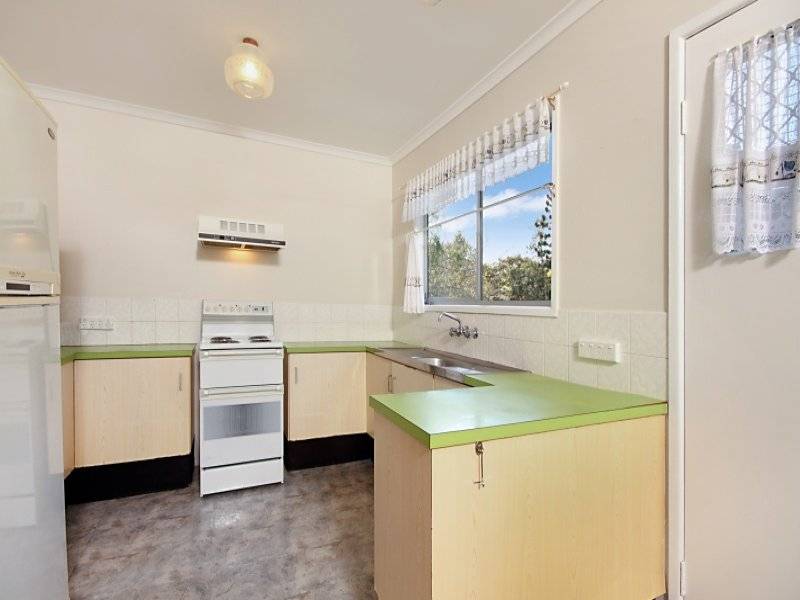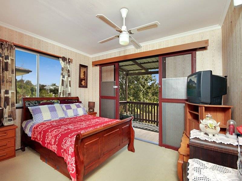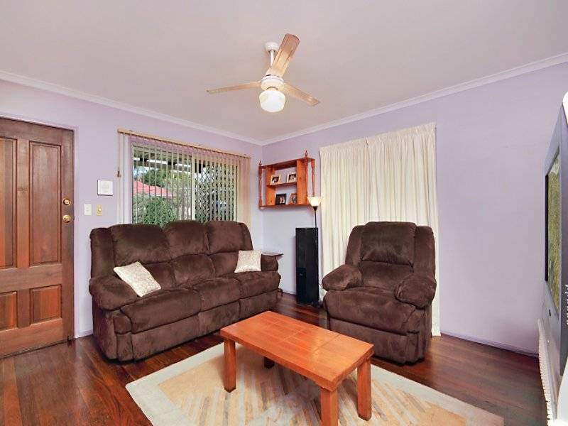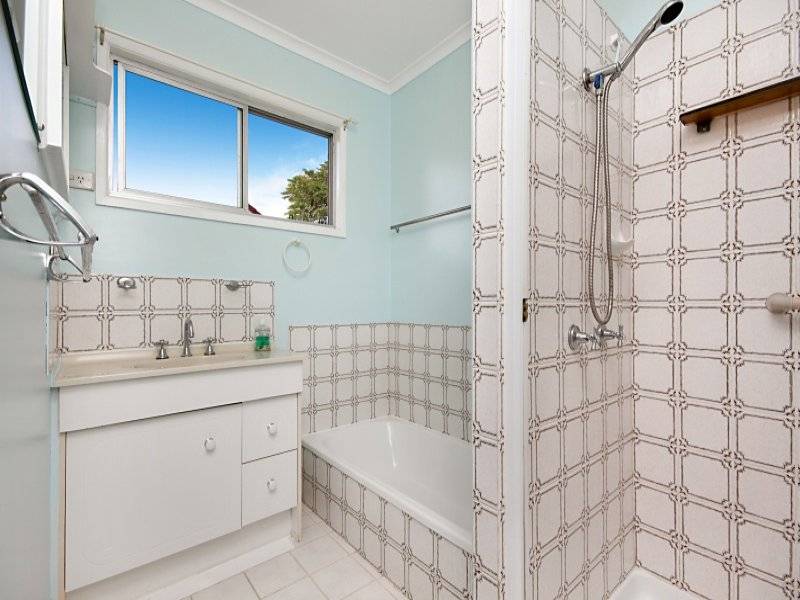 A covered patio area overlooks the private back garden complete with garden shed and cubby house.