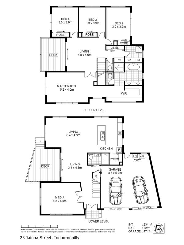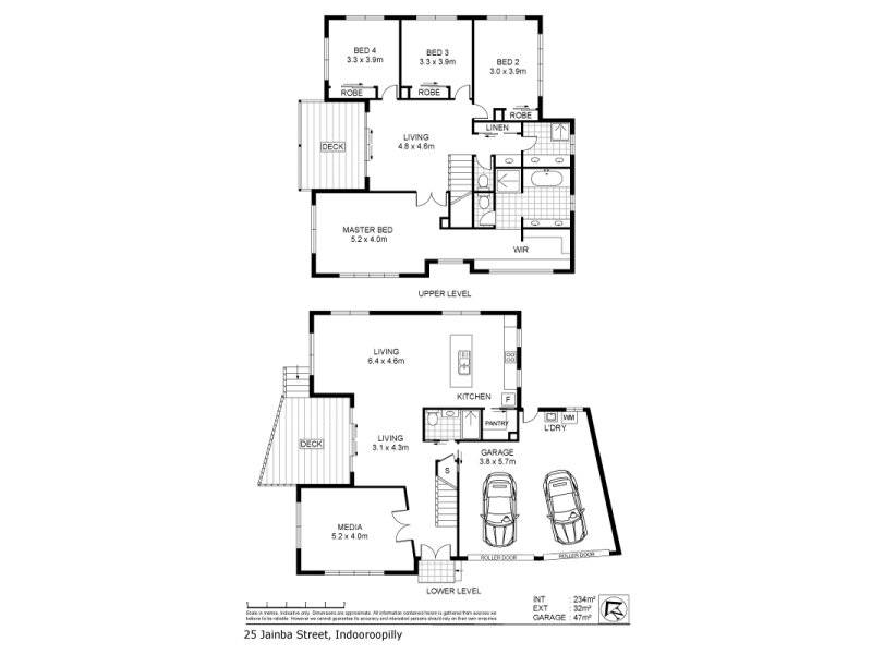 The upper level is comprised of four large bedrooms, all with built-in wardrobes, (master with ensuite and walk-in wardrobe) a large bathroom with separate bath and shower, and impressively features an additional living area offering flexibility as a study or play room or media area.