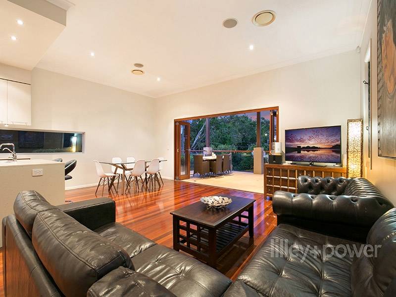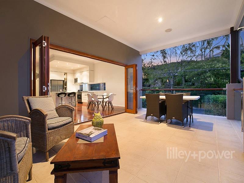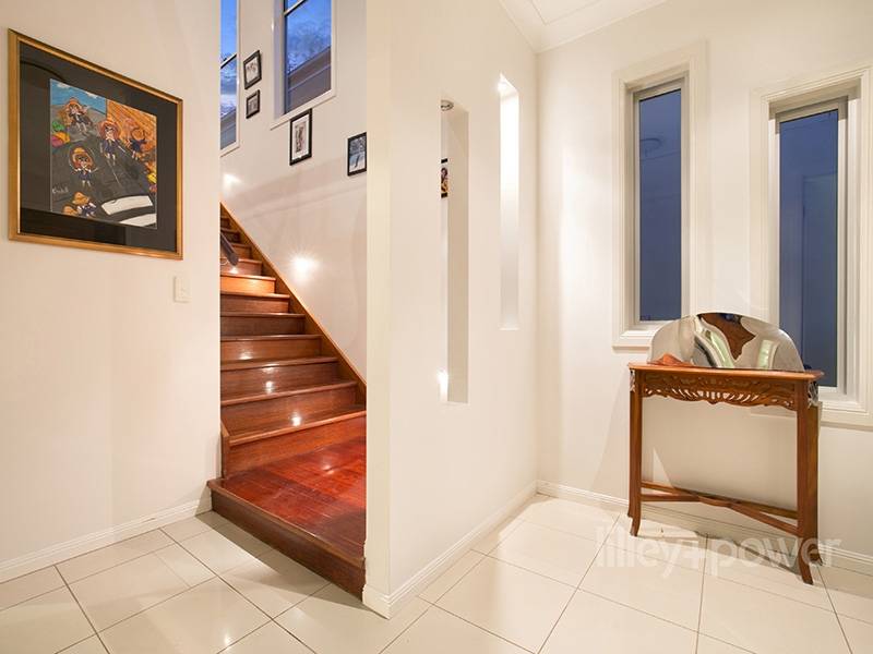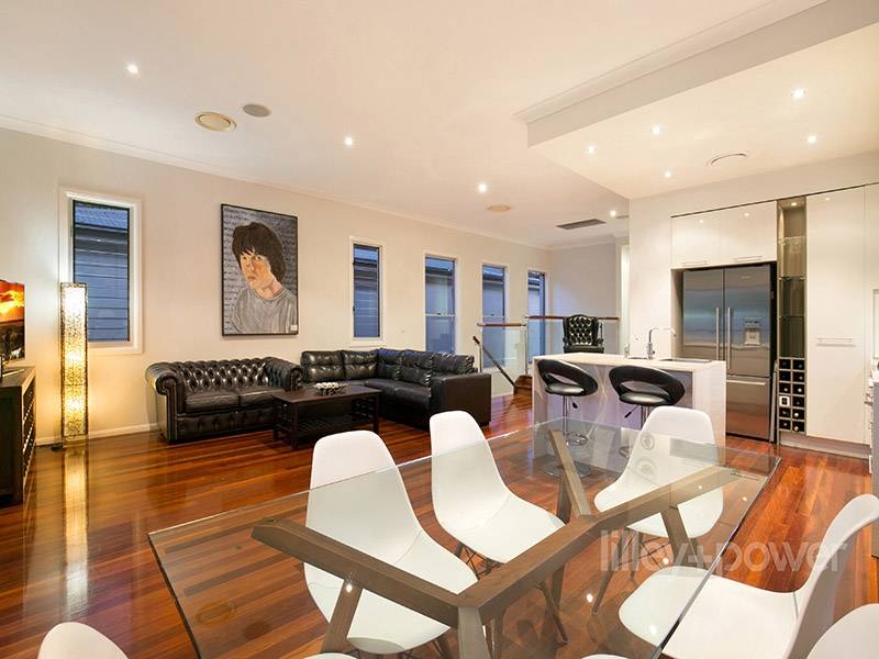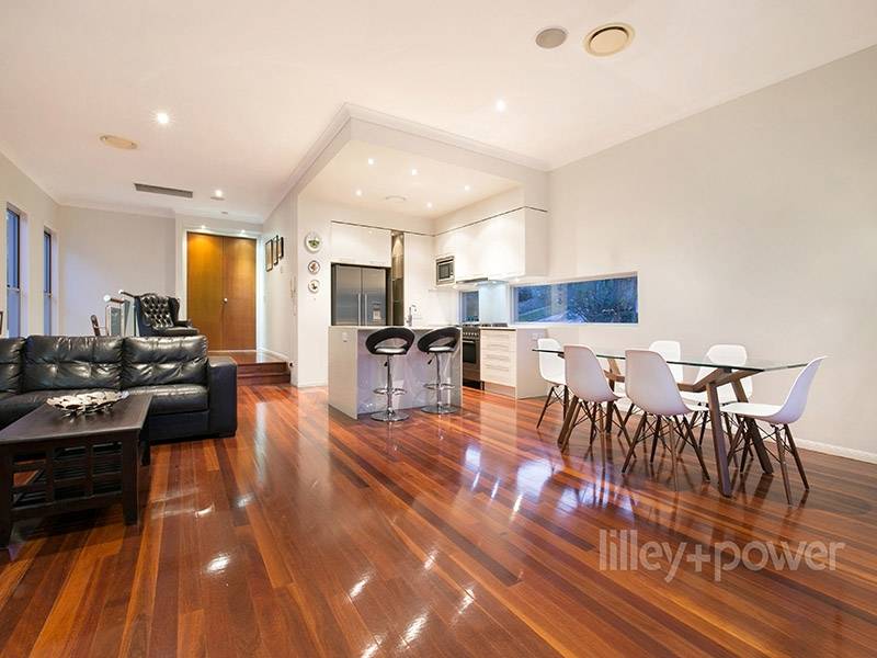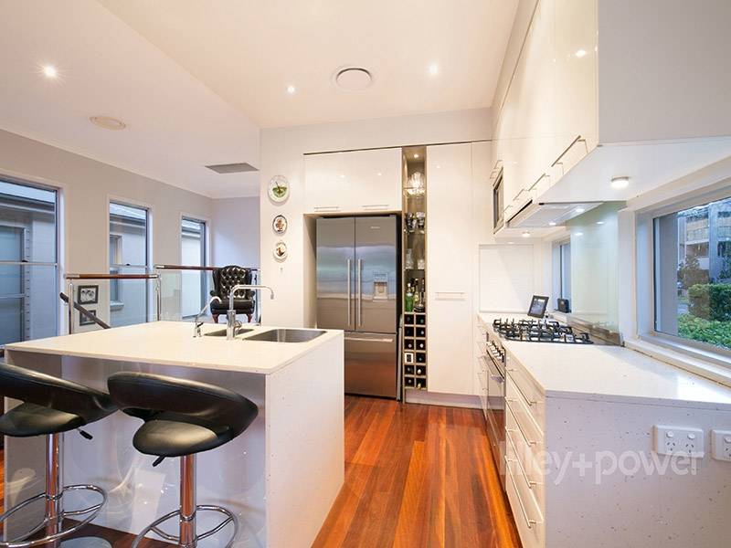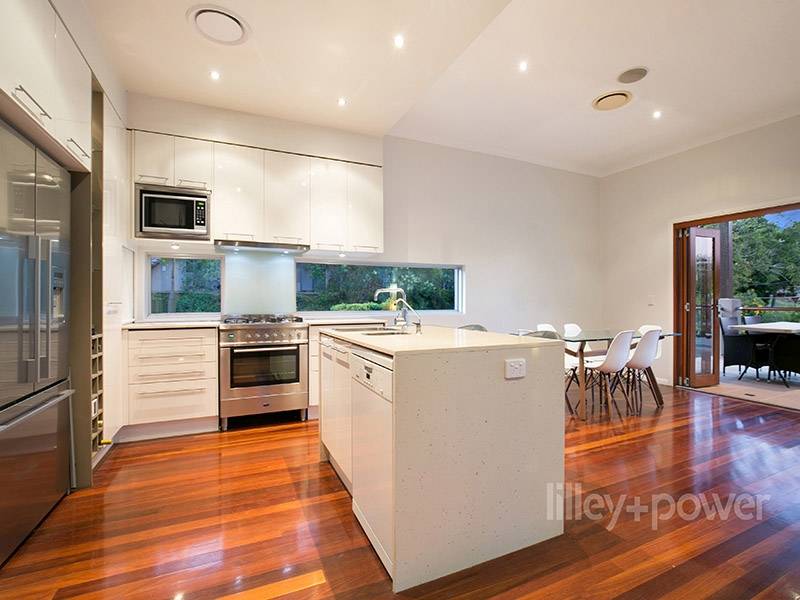 This immaculate, contemporary abode perfectly pairs sophisticated design with relaxed open plan living. Showcasing striking features throughout this property is ideal for those seeking luxurious finishes and grand proportions. Spanning three large levels the layout has been brilliantly configured to create stunning entertaining areas whilst providing prized features for every-day living including an abundance of space and storage. The upper level living and entertaining area exudes elegance with a modern edge through its superb combination of glass accents, polished hardwood floors, high ceilings and a scenic, private north-east outlook. Enjoy the tranquility of the property’s sunny aspect and leafy outlook from the large covered entertainer’s balcony. The contemporary kitchen provides an abundance of storage space and features European appliances including an impressive six-burner gas cooktop and ILVE oven.