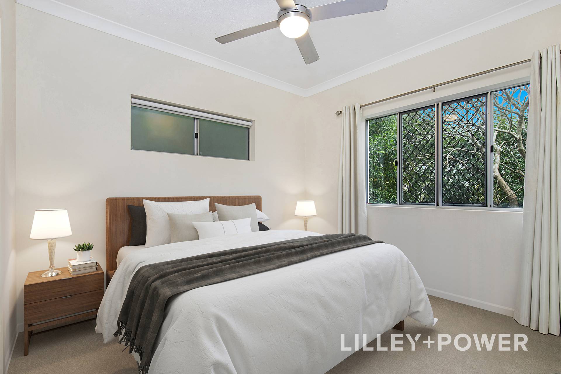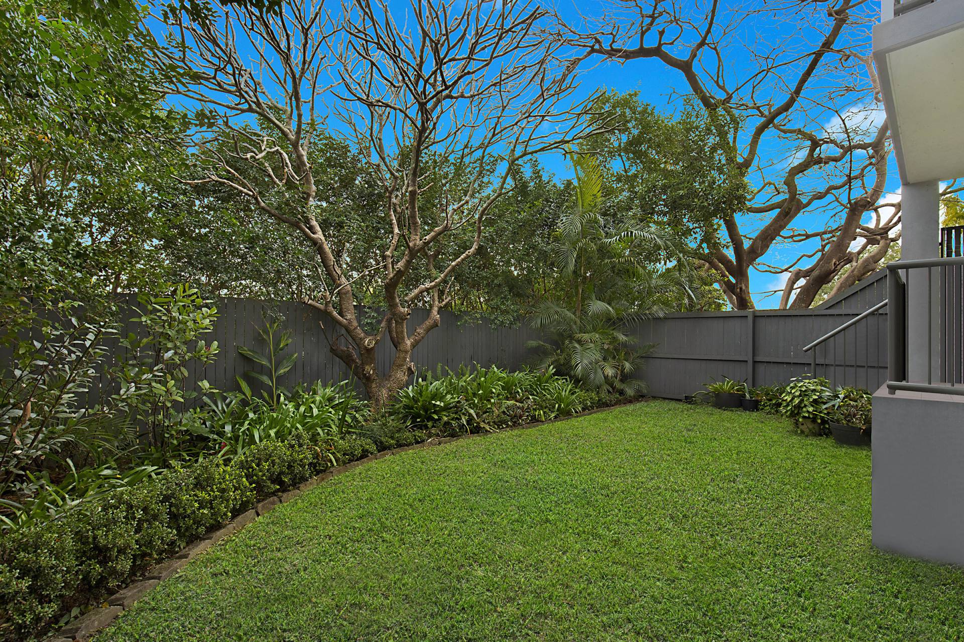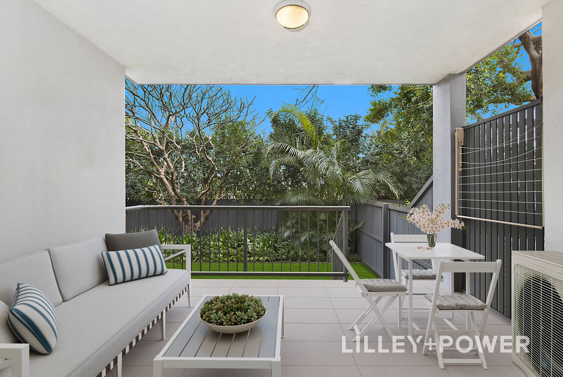 The property’s exclusive use courtyard boasts an impressive 60m2 of grassed and landscaped grounds and is as scenic as it is private with its border of Lilly Pillies, Palms and a feature Frangipani tree. The large covered balcony overlooks the expansive green space and is perfectly proportioned for outdoor entertaining or simply unwinding while taking in glimpses of the city scape through the trees.