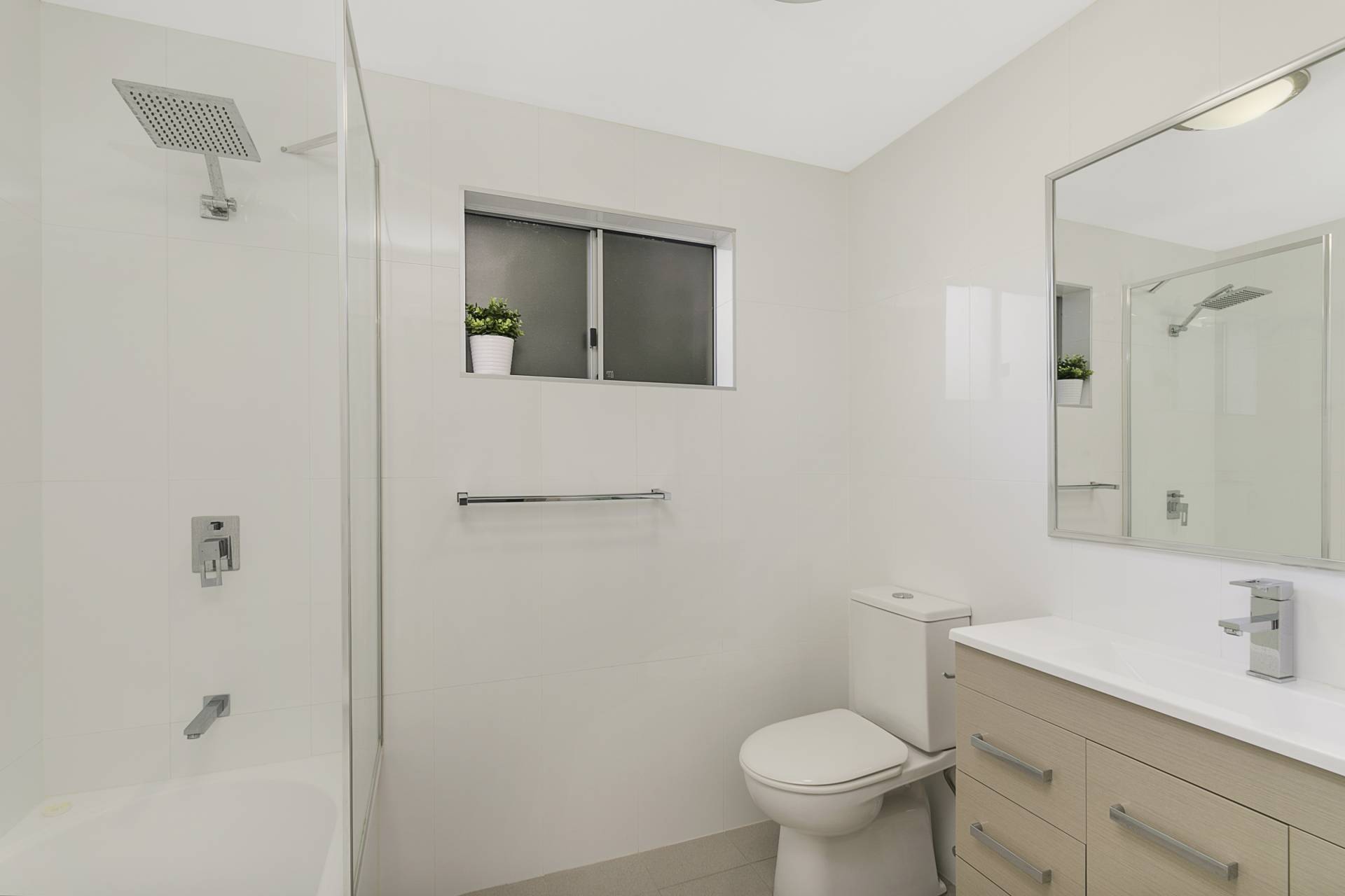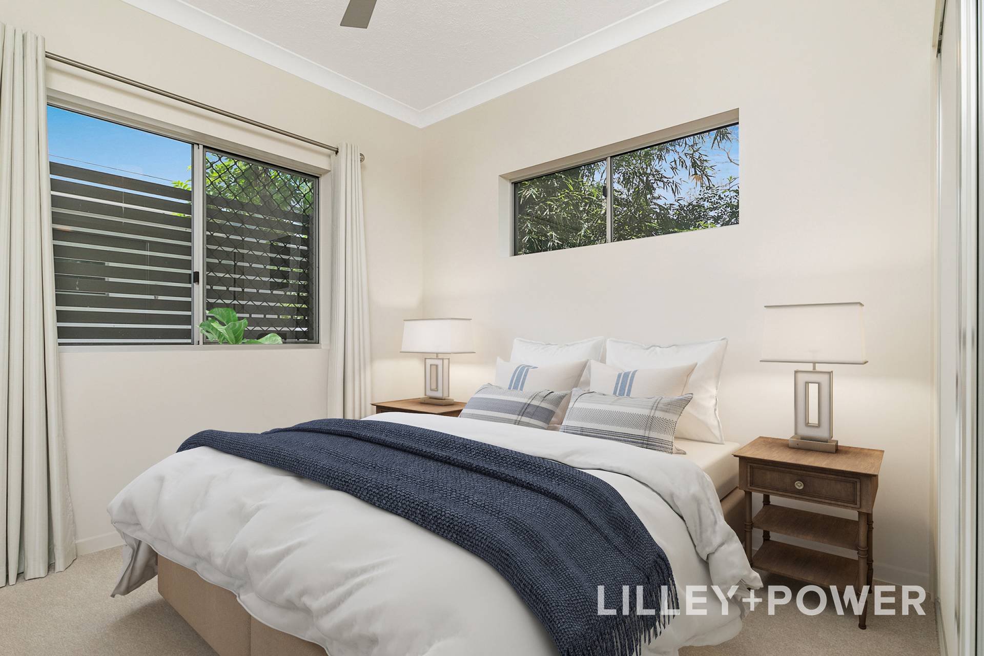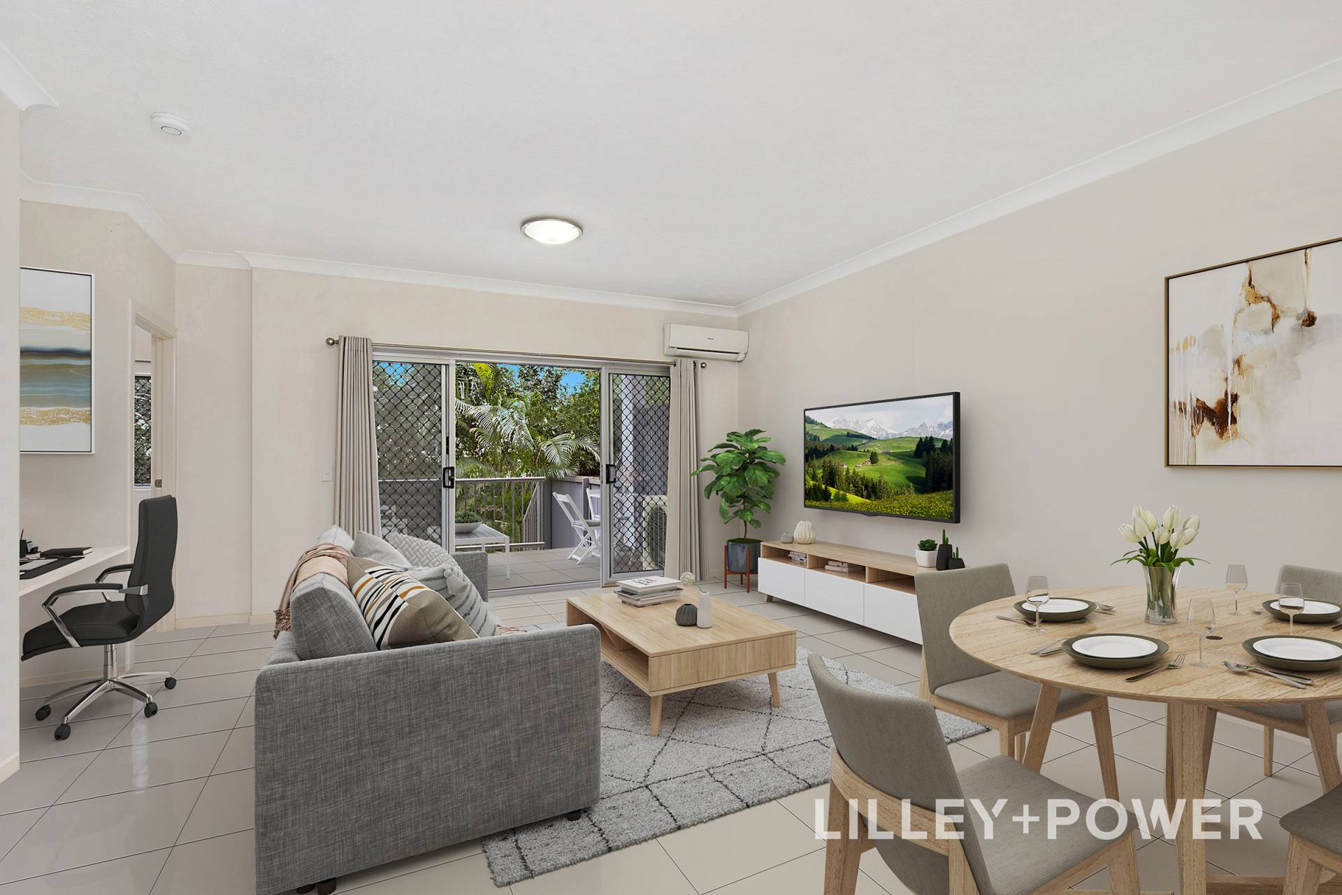 The property’s exclusive use courtyard boasts an impressive 60m2 of grassed and landscaped grounds and is as scenic as it is private with its border of Lilly Pillies, Palms and a feature Frangipani tree. The large covered balcony overlooks the expansive green space and is perfectly proportioned for outdoor entertaining or simply unwinding while taking in glimpses of the city scape through the trees.