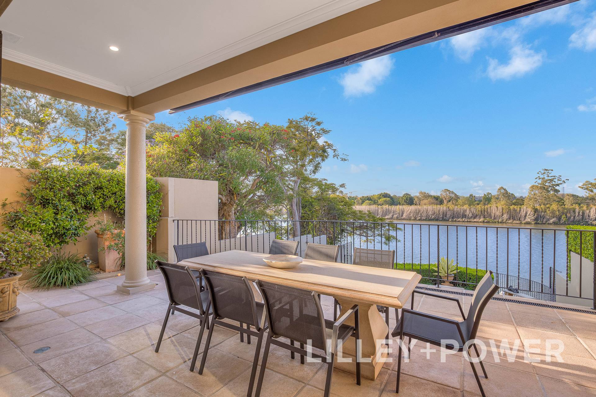 An immediate panorama of serene river views greet you upon entry and continue to enchant from the formal dining and lounge, to the covered entertainer’s terrace, across the pool and sundeck, and the master suite.